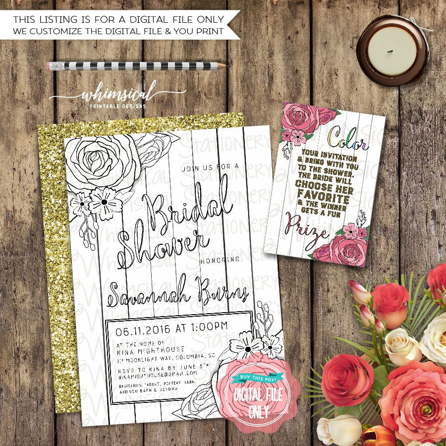 "Coloring Pages, Floral Wood" Printable Bridal Shower Invite
